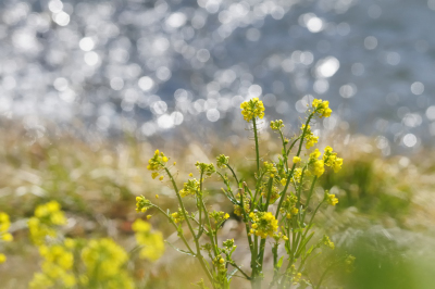光がきらめく川面に 菜の花