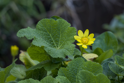 家庭菜園の葉のわきから ひょっこりとリュウキンカ