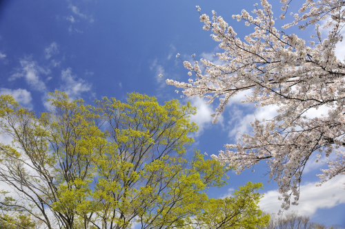 1:2014年 4月 1日 ちはら台 かずさの道 南5 桜とマンションの緑、青空と白い雲 散歩道;「桜よ 青空に」へ |