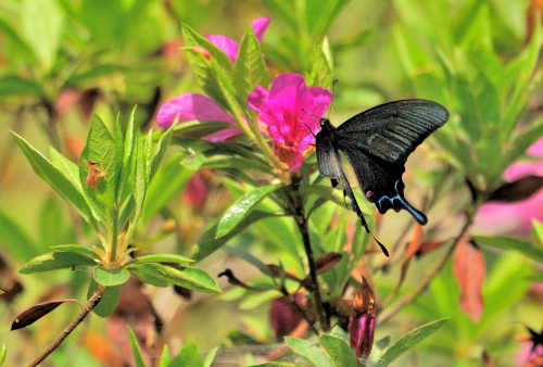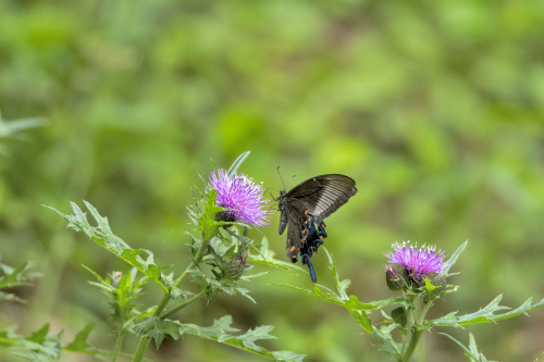 黒に青のメタリック仕上げの羽が目立つ蝶。