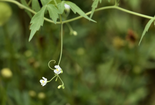 白く小さなフウセンカズラ、短いツルがひょいとのび