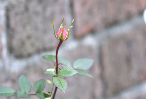 寒風吹きすさぶ北面の玄関先、蕾が開きかけた野バラ