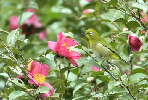 そのツバキにぶら下がって、よそ見のメジロ
