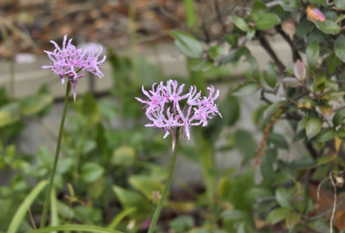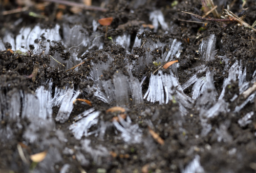 植え込みの陰で ひっそりと冬の花 霜柱