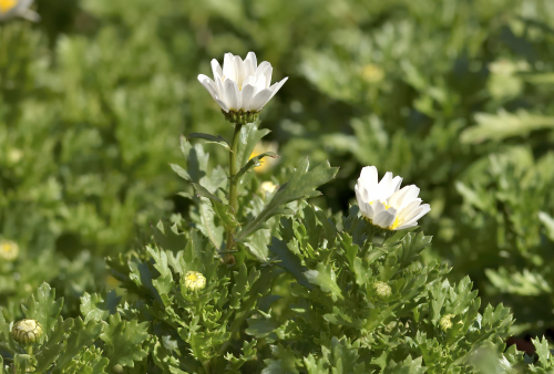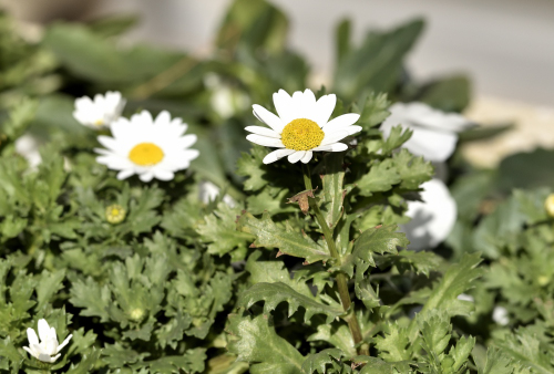 陽と水はしっかりか、元気な事務所脇プランタの寒白菊