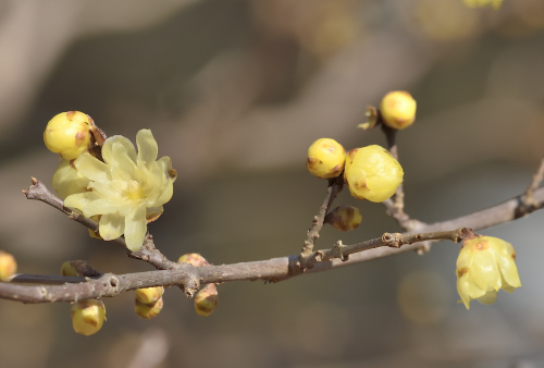 蝋梅や紅梅もまばら、公園も水不足のようです。