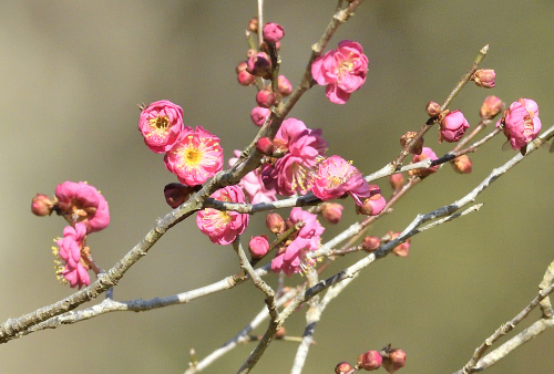 花が少ない梅林の紅梅、目立つ赤が寂しい