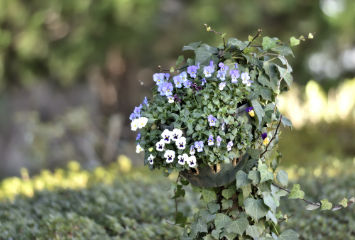 木杭に絡まったキヅタ(西洋木蔦)に寄り添うパンジー