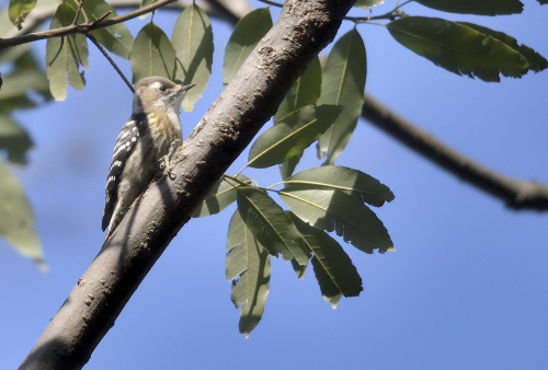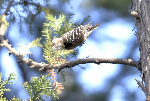 陽が差し込む枝で 虫探しに忙しいコゲラ